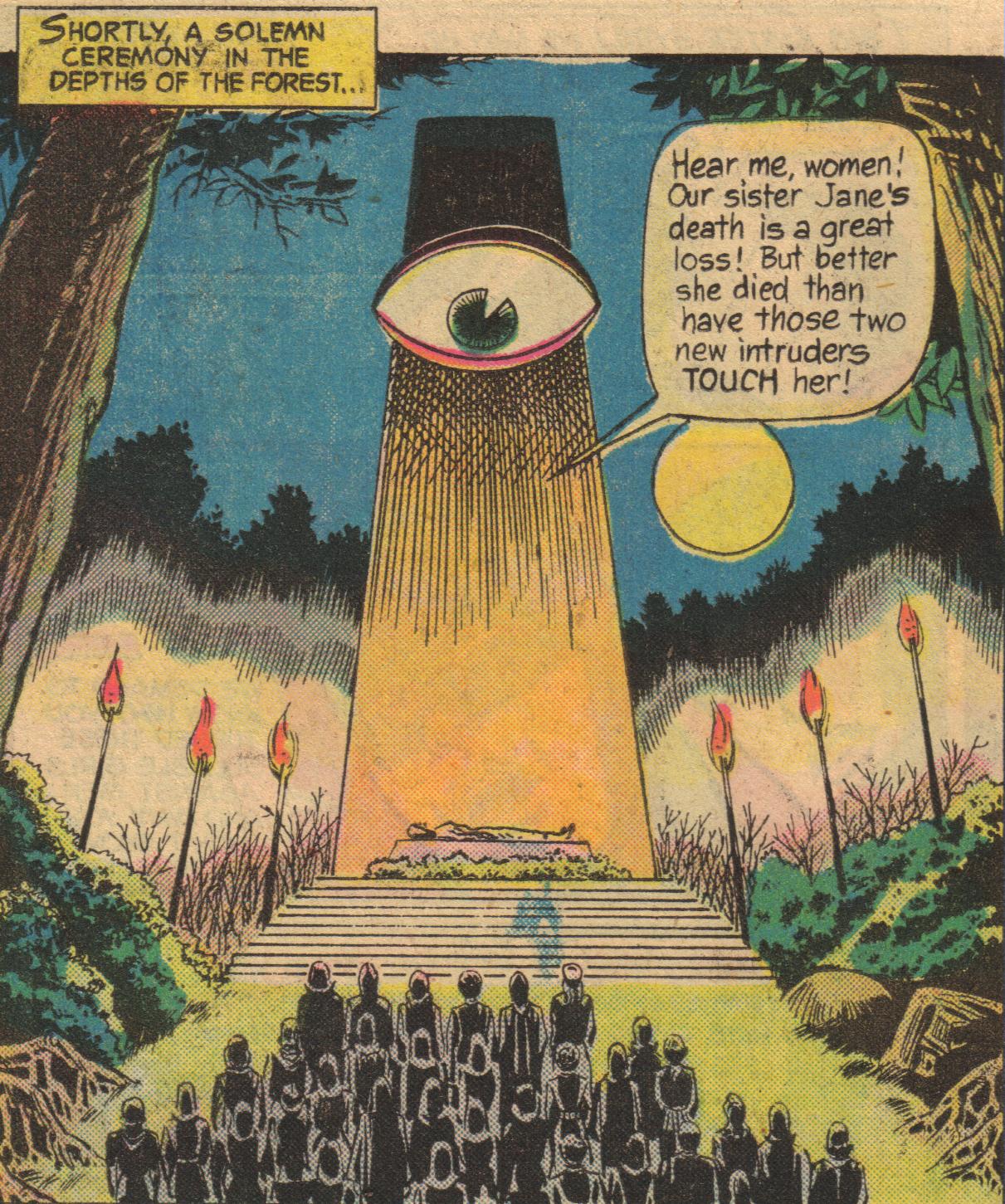Big Sister takes the occasion to reprimand Sisters Sara and Diana, who have been having second thoughts about the Big Sister's plans. Big Sister also orders the execution of all the jailed men, so the Super-Sons choose this moment to act and confront the monocular obelisk. This does not go well, and Superman Jr. must enact a quick escape.
